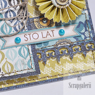 Ozdobny brzeg powstał dzięki dziurkaczowi MS Iron Fence, a ćwieki z cyframi pochodzą z zestawów ćwieków MME Stella & Rose - akurat trafiły się te właściwe, żeby złożyć liczbę urodzin :-) Rozetki z wykrojnika zastąpiły kwiaty.